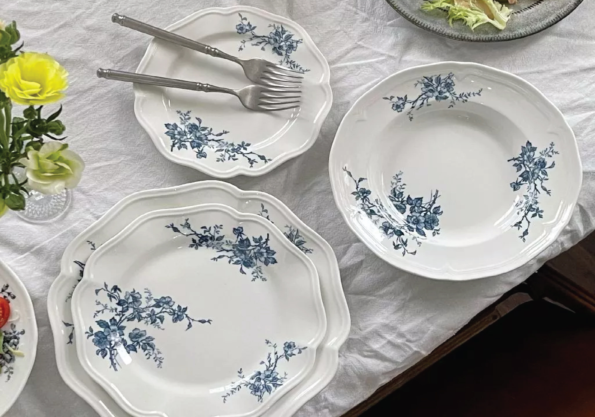 Đường viền họa tiết trên đĩa ăn sứ xương mang lại nét mộc mạc tinh tế cho bộ đồ ăn màu trắng theo cách không quá rườm rà nhờ giữ nguyên bề mặt trơn ở lòng đĩa. Hoa văn có thể mở rộng trên toàn bộ viền của đĩa và mang các sắc thái lẫn chủ đề khác nhau. Mỗi kiểu dáng và mẫu họa tiết sẽ bổ sung cho món ăn các phong cách khác nhau, nhưng tựu chung vẫn khiến món ăn đơn giản trở nên ấn tượng và thu hút hơn.